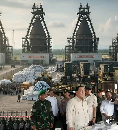 Video siaran langsung yang disiarkan melalui kanal YouTube resmi memperlihatkan Presiden Prabowo berdiri di tengah area industri berat, mengenakan kemeja safari khasnya.