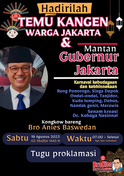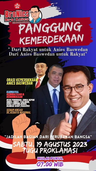 BroNies Akan Gelar “Panggung Kemerdekaan” dan “Temu Kangen Warga Jakarta Dengan Mantan Gubernur Anies Baswedan” di Tugu Proklamasi