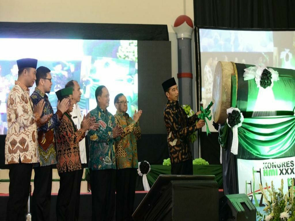 Tepuk tangan dari peserta menyambut pernyataan yang disampaikan Jokowi. Ia juga memukul beduk sebagai tanda membuka kongres ke-30 HMI.