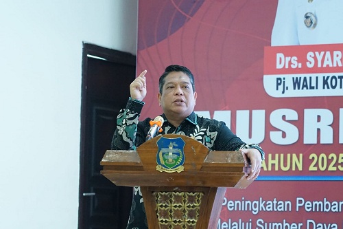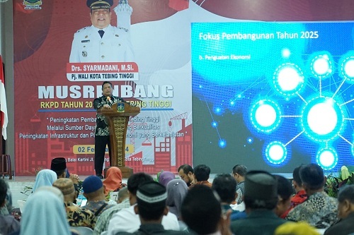 BUKITTINGGI SUMUT – Penjabat (Pj.) Wali Kota Tebing Tinggi Drs. Syarmadani, M.Si. didampingi Pj. Sekdako H. Kamlan Mursyid, S.H., M.M., CGCAE bersama Forkopimda (Forum Koordinasi Pimpinan Daerah) dan stakeholder terkait, membuka Musrenbang (Musyawarah Rencana Pembangunan) RKPD (Rencana Kerja Pemerintah Daerah) Kota Tebing Tinggi tahun 2025, Jumat (02/02/2024) bertempat di Gedung Balai Kartini Convention Center Jl. Gunung Leuser BP7.