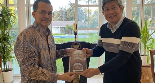 Dubes Muhammad Najib memberikan cinderamata berupa buku novel berjudul “Diberanda Istana Alhambra” karyanya.