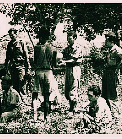 Photo Suasana front Bekasi 1947. Mufreni Mu’min, TKR, berdiri tengah hadap kamera, menerima buah kelapa. Rosihan Anwar, wartawan perang, duduk kanan, membaca catatan