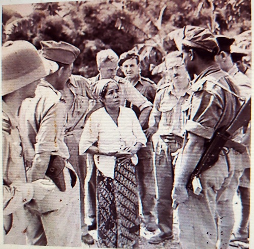 Photo atas seorang ibu di Jakarta pada jaman pendudulkan tahun 1946-1949 dari daerah Republik mau ke kawasan pendudukan Belanda. Ia dikepung serdadu Belanda. Tampaknya ia tak gentar atau alami demoralisasi.