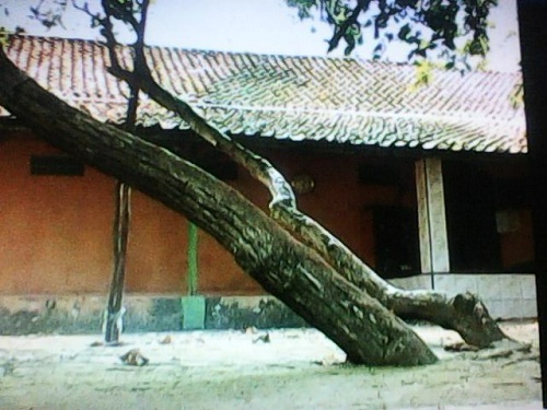 Posisi pohon pada photo di atas dalam bahasa Betawi Bekasi disebut déngklok. Rengas Déngklok. Dalam bahasa Betawi umum disebut doyong. Mau rubuh, sudah tak mungkin lagi ditunjang walau paké rumus PT = 0%.