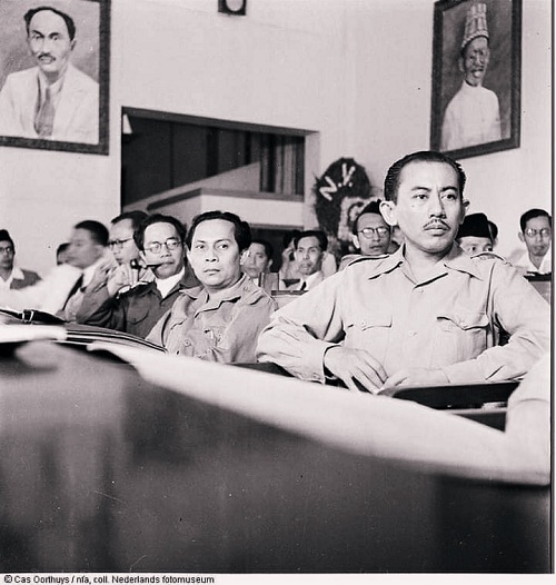 Photo atas dari kiri ke kanan: Mr Amir Sjarifoeddin Harahap, Sutan Sjahrir dan Mr Mohammad Roem saat menghadiri rapat pleno KNIP (Komite Nasional Indonesia Pusat) ke 5 di Malang pada Tahun 1947.Sumber foto : Cas Oorthuys / Nederlands Fotomuseum.