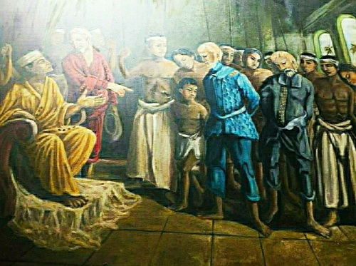 Lukisan tahun 1610. Kiri “pangeran” Jayakarta digeruduk pebisnis Inggris yang dikawal orang2 Betawi. Mereka bersengketa kasus jual beli tanah