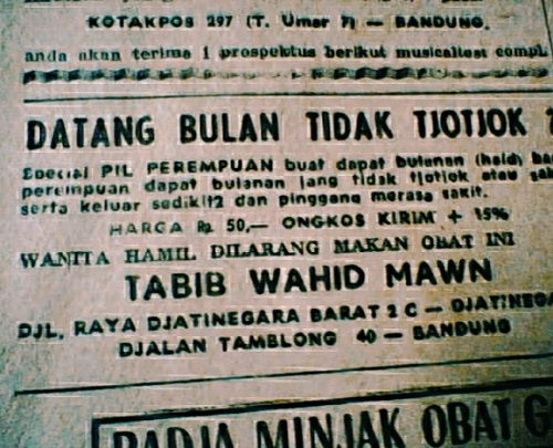 Di Jatinegara Tabib Wahid Mawn. Juga mengobati rupa2 penyakit, tapi yang banyak diiklankan obat untuk gangguan saat wanita menapause (datang bulan). Gangguan ini disebut Datang Bulan Tidak Tjotjok/Cocok, lihat photo atas.