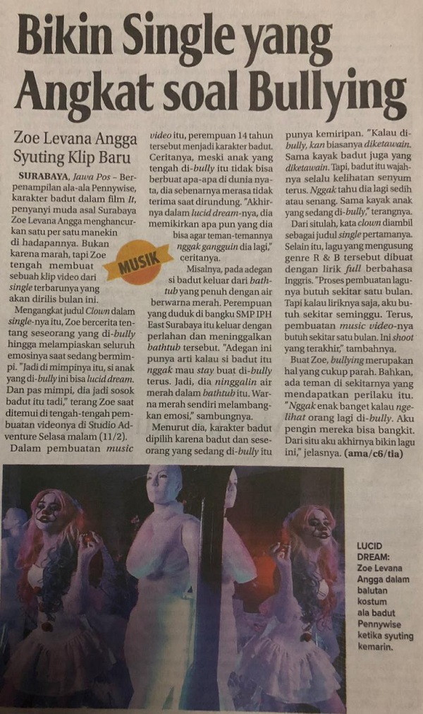 “Saya mimpi menjadi badut yang menakutkan, dan mencari orang orang yang membully saya,” kata Zoe yang gemar kuliner tahu tek.