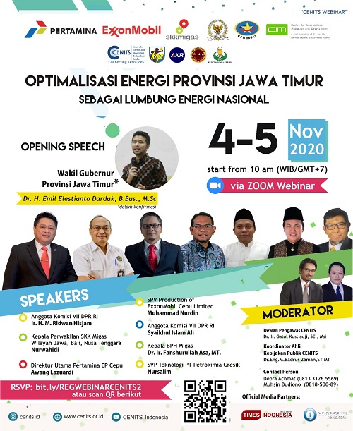 ZONASATUNEWS.COM–CENITS (Centre for Energy and Innovation Technology Studies), bekerjasama dengan KNPI Jawa Timur dan CIM-GIZ (The Centre for Internasional Migration and Development – Deutsche Gessellschaft fuer Internazionale Zusammenarbeit) menyelenggarakan webinar selama 2 (dua) hari tanggal 4-5 November 2020 dengan tema: “Optimalisasi Energi Untuk Provinsi Jawa Timur Sebagai Lumbung Energi Nasional”.