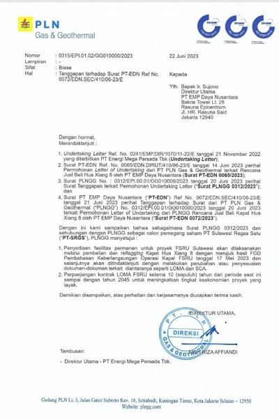 “Lantas pada tanggal 22 Juni 2023, PLNGG mengeluarkan surat Nomor 0315/EPI.01.02/GG0100000/2023 perihal Tanggapan terhadap surat PT-EDN Ref No. 0072/EDN.SEC/410/06-23/E, yang pada intinya PLNGG menyetujui dua hal. Pertama, penyediaan fasilitas permanen untuk proyek FSRU Sulawesi akan dilaksanakan melalui pembelian dan reflagging kapal Hua Xiang 8. Kedua, perpanjangan kontrak LOMA FSRU selama sepuluh tahun dari periode saat ini sampai dengan tahun tahun 2045,” ungkapnya.