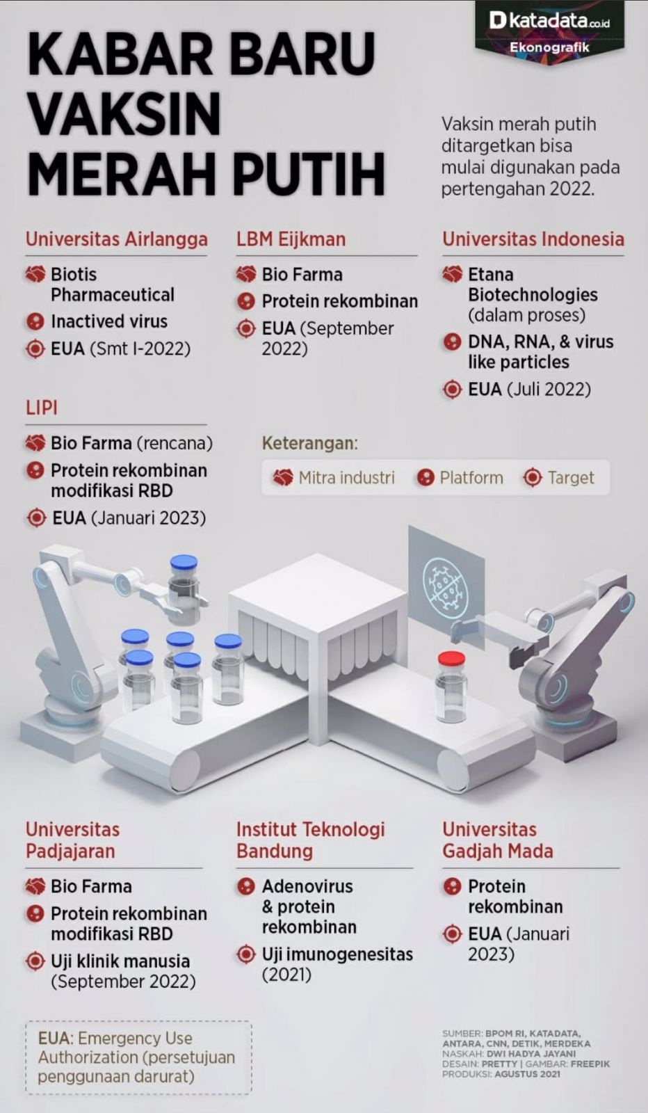 Sementara itu vaksin yang dikembangkan oleh anak bangsa sendiri, vaksin Merah Putih dan Vaksin Nusantara tengah bersiap-siap untuk bisa segera diproduksi. Tahun 2022 diperkirakan sudah bisa dilakukan produksi massal.
