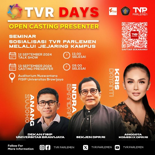 JAKARTA – TVR Parlemen, sebagai saluran televisi resmi yang menyuarakan kegiatan dan program-program DPR RI, akan kembali mengadakan acara “TVR DAYS & Open Casting Presenter”. Kali ini kegiatan akan berlangsung di Universitas Brawijaya, Malang pada 12-13 September 2024.