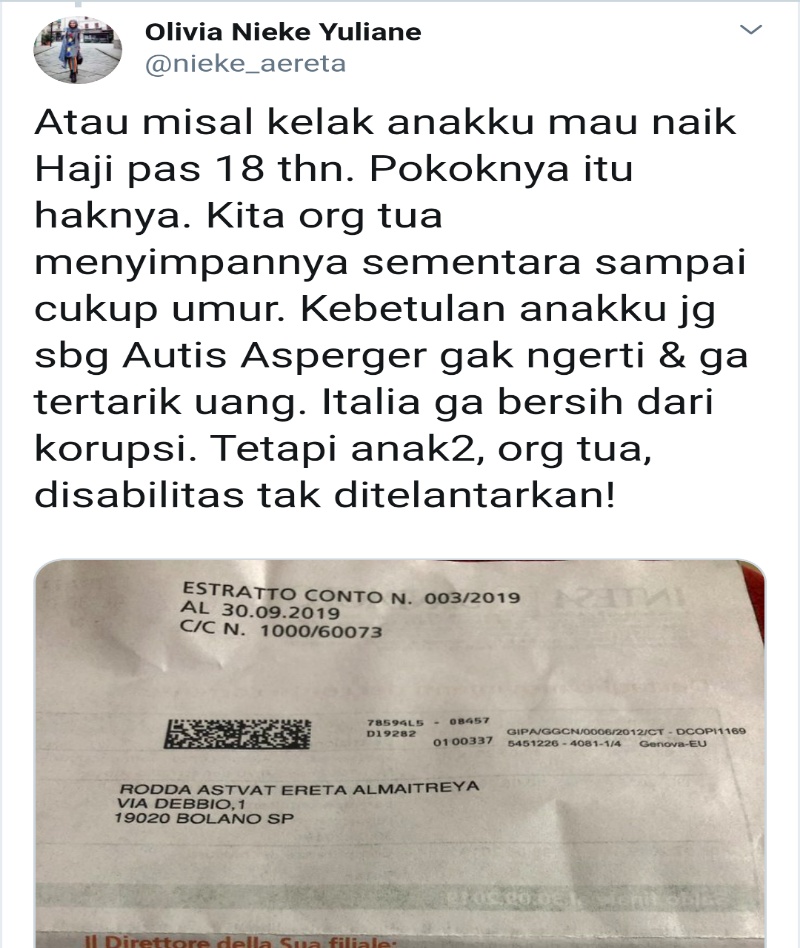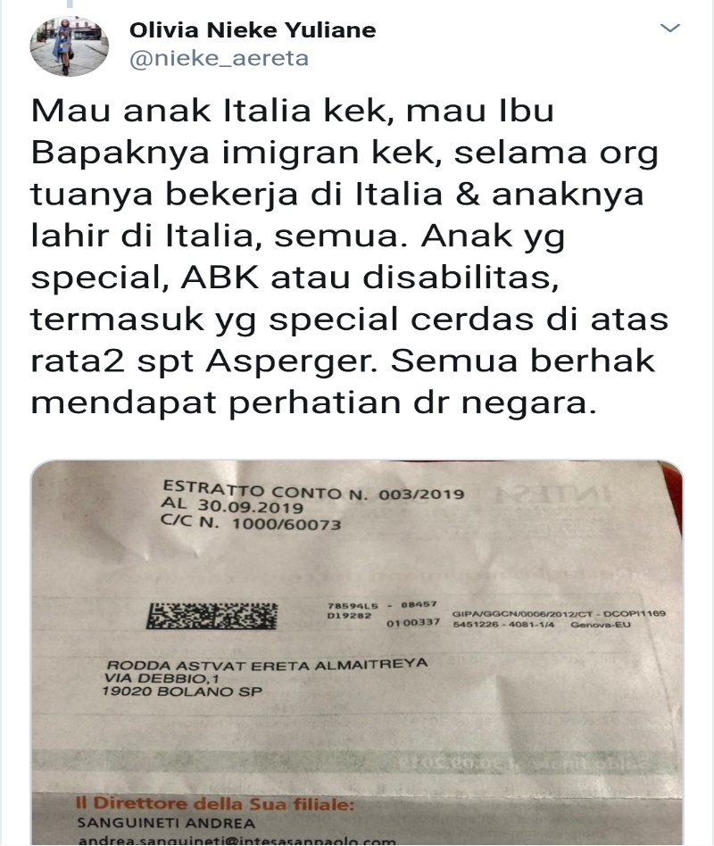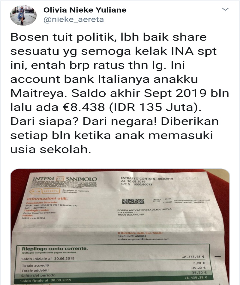Zonasatu News — Membaca tuit ibu Olivia Nieke Yuliane yang tinggal di Italia, sungguh menggugah mimpi rakyat Indonesia. Tuit itu diunggah tanggal 20 Oktober 2019, diakun twitter miliknya.