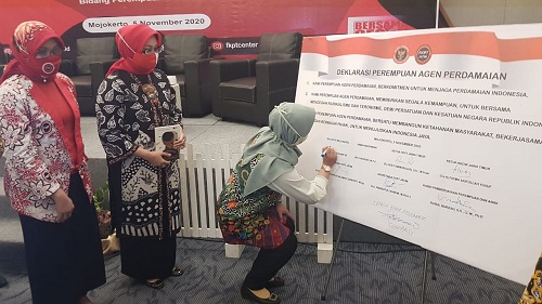 Acara Diskusi dan Deklarasi Perempuan Agen Perdamaian ini diselenggarakan Badan Nasional Penanggulangan Teroris (BNPT) bekerjasama dengan Forum Koordinasi Pencegahan Terorisme (FKPT) Jatim. Acara itu dihadiri 70 orang peserta perempuan yang terdiri dari unsur kades perempuan, ASN perempuan, organisasi perempuan serta ormas anggota Badan Koordinasi Organisasi Wanita (BKOW) Jatim.