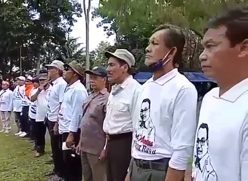 Mereka berbaris rapi seperi layaknya upacara. Bendera merah putih dikibarkan dekat pembaca deklarasi. Langit cerah. Angin tampak mengalir, menggerakkan daun dan ranting. Rumput dan pohon bergerak perlahan.