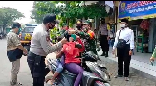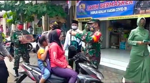 Kanit Binmas Ipda Zainul yang memimpin jalannya giat mengatakan,kegiatan ini difokuskan pada penanganan pandemi Covid-19 berupa kegiatan sosial berbagi masker sesuai anjuran Kapolda Jatim Bermasker Jatim Sehat,”tegasnya
