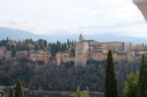 Kami diarahkan ke pintu belakang yang terbuka. Setelah melaluinya, di taman yang tertata asri, menyerupai taman-taman di dalam Alhambra, nampak Istana Alhambra terbentang tanpa halangan sama sekali, seolah bertengger di bukit menjulang dan hijau.