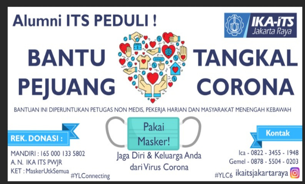 Ketua Umum IKA ITS Jakarta Raya, Rifqi Isnanda mengatakan, dari Gerakan awal pengumpulan Donasi di internal alumni yang bertajuk “ 1 Masker dari anda Menjaga 1 keluarga kami ”, yang dilakukan oleh para alumni muda IKA ITS yang ada di wilayah Jakarta Raya melalui Youth Leadership Camp (YLC) Connectionnya.