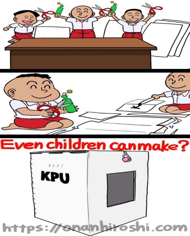Hiroshi Onan menyindir kotak karton buatan KPU yang digembok. Digambarkan dalam karikatur itu, sekelompok anak-anak Sekolah Dasar (berseragam putih-merah) berpikir kotak itu bisa dibuat, karena bahannya mudah didapat, dan cara membuatnya juga mudah.Lalu, mereka beramai-ramai membuatnya. Dan bisa.
