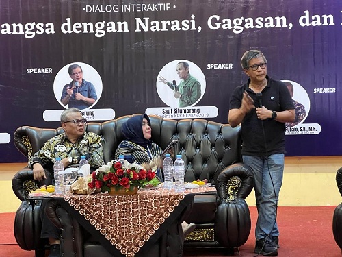 Kolaborasi Sekber KIB bersama Univ Dr Sutomo Surabaya, menggelar “Dialog Interaktif”dengan tema “Membangun Bangsa dengan Narasi, Gagasan dan Karya”, Kamis (6/7/2023). Pengamat politik Rocky Gerung sedang menyampaikan narasi.