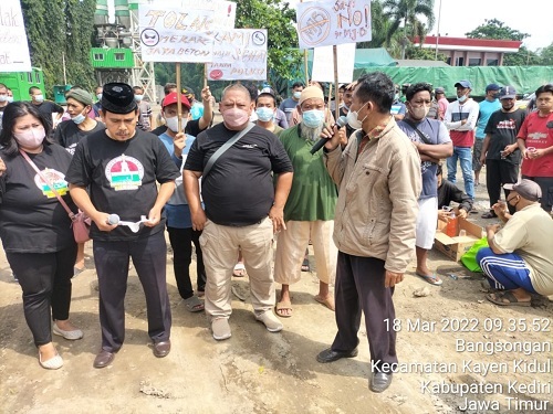 Dengan membawa banner dan puluhan papan bertuliskan berbagai bentuk wujud penolakan dan aspirasi warga dua desa di Kabupaten Kediri itu.