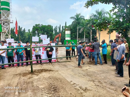 Mereka juga membawa puluhan batang pohon bambu untuk menutup akses jalan masuk pabrik milik PT Merak Jaya Beton yang sedang dalam tahap pembangunan yang berlokasi disekitar kedua desa tersebut.