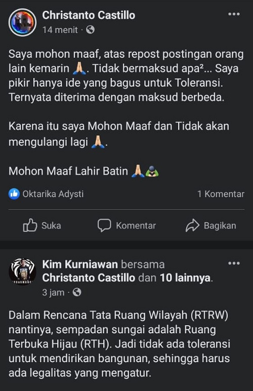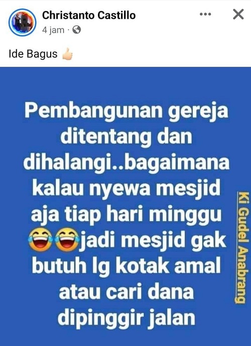 “Pembangunan gereja ditentang dan dihalangi…bagaimana kalau nyewa mesjid aja tiap hari minggu,” kata Christanto dalam postingan FB yang disertai emoticon ketawa.