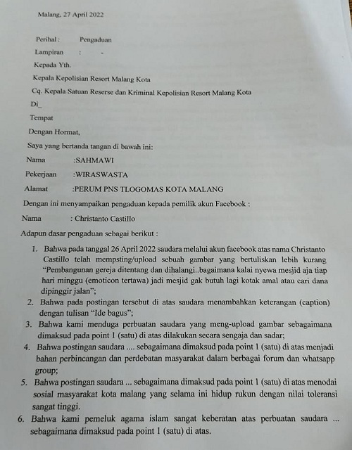 “Saya merasa postingan Christanto Castillo menghasut dan dapat menimbulkan munculnya sikap intoleran di Malang Raya, karena postingan dia di Facebook memunculkan ketersinggungan kelompok tertentu seperti kelompok muslim,” ujar Sahmawi usai membuat laporan ke Polresta Kota Malang, Rabu 27/04/2022.