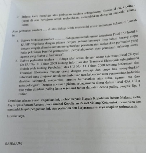Pemilik akun Facebook tersebut dilaporkan dengan tuduhan ancaman serta penghasutan di akun media sosial Facebook miliknya yang diduga dapat menodai kerukunan masyarakat Kota Malang, dan dapat memicu konflik horizontal di tengah masyarakat.