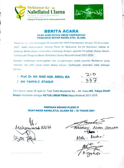 ZONASATUNEWS.COM, LAMPUNG — Kyai Yahya Cholil Staquf resmi terpilih sebagai Ketua Tanfidziyah PBNU dalam Muktamar ke-34 di Lampung (22-24 Desember 2021). Yahya Cholil Staquf mendapatkan 337 suara mengungguli Said Aqil yang mendapatkan 210 suara.
