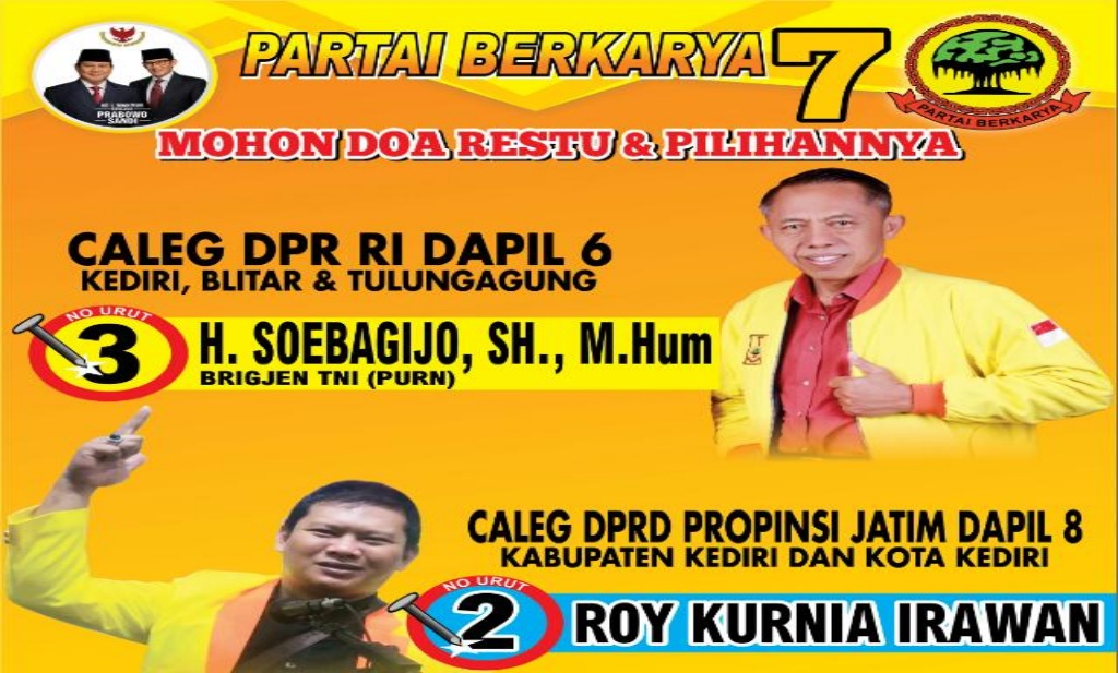 Seperti duet caleg Partai Berkarya di Kediri, caleg DPR-RI nomor urut 3, Brigjen TNI (Purn) H. Soebagijo SH.M.Hum, untuk daerah pemilihan Kota/Kabupaten Kediri, Blitar dan Tulung Agung. Dia bertandem dengan caleg DPRD Propinsi Jawa Timur nomor urut 2, Roy Kurnia Irawan untuk daerah pemilihan Kota Kediri Kediri dan Kabupaten Kediri.