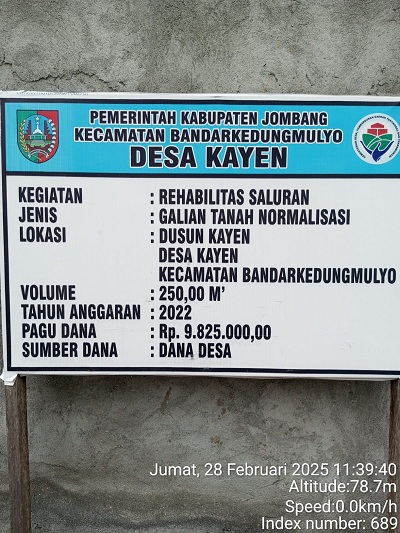 Pada tahun 2021 di Desa Kayen diadakan kegiatan rehabilitasi saluran dengan jenis kegiatan galian tanah normalisasi yang menelan biaya Rp 5.250.000,- dengan volume 270 m. Ditempat yang sama pula dengan kegiatan yang sama pada tahun 2022, namun anggarannya berbeda, karena pada tahun 2022 biaya anggaran yang di butuhkan agak lebih mahal, di papan kegiatan tertera Rp 9.825.000,-