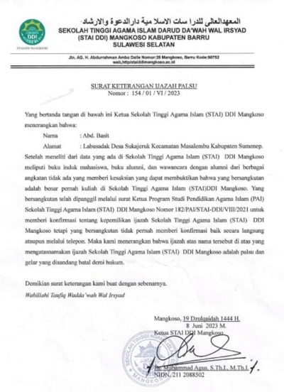 Pada tahun 2023 Abdul Basit ketahuan menggunakan ijasah palsu dan telah diberhentikan gaji sertifikasinya oleh Kemenag Kabupaten Sumenep. Dia juga dipecat sebagai kepala sekolah di MI DDI tersebut.