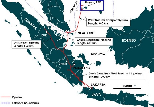 Di atas adalah peta alur sistem West Natuna Transportation System (WNTS) yang menjadi titik awal penting dalam menyambungkan pasokan gas dari Laut Natuna ke pasar domestik dan regional. Meski visual utamanya fokus ke sistem bawah laut menuju Singapura, ini pun mencerminkan akses jalur strategis yang tengah dikembangkan ke Batam dan seterusnya ke Jawa–Sumatra.