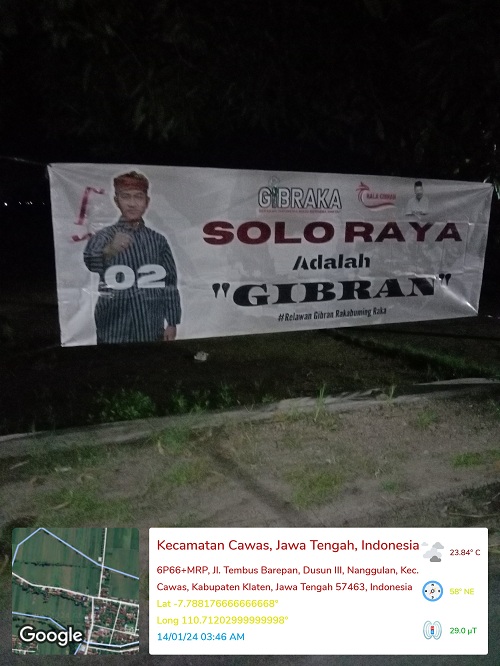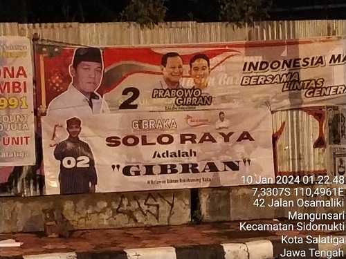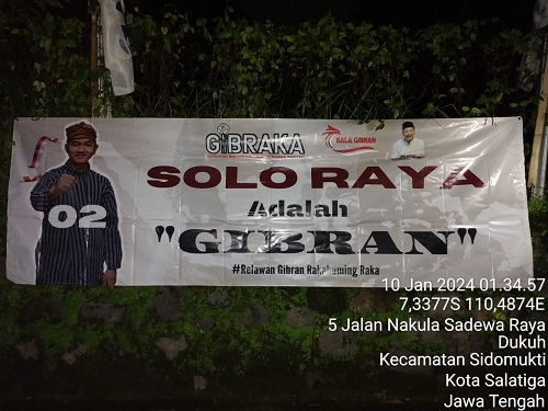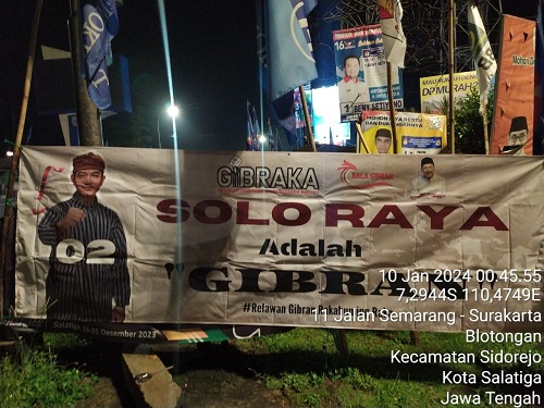 Spanduk dengan foto Gibran Rakabuming Raka berpakaian Jawa, tangan mengepal dengan tagline “GIBRAKA Solo Raya Adalah Gibran” menyebar di seantero Solo Raya.