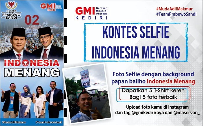 Kediri, Zonasatu News–Gerakan Milenial Indonesia (GMI) Kediri membuat gebrakan untuk menarik minat politik generasi milenial se-Kediri Raya. Kontes selfie dengan tema Indonesia Menang. Syaratnya ringan saja, cukup berhenti didepan Alfamart Jalan Kilisuci Kota Kediri lalu berfoto selfie dengan background papan baliho GMI Kediri Indonesia Menang.