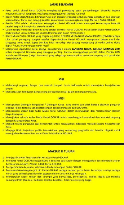 Partai GOLKAR wajib menguji keilmuan berpartai dan berorganisasi serta memiliki pengetahuan wawasan luas kader partai GOLKAR, terutama mengasah mental, karakter menjadi seorang pemimpin.