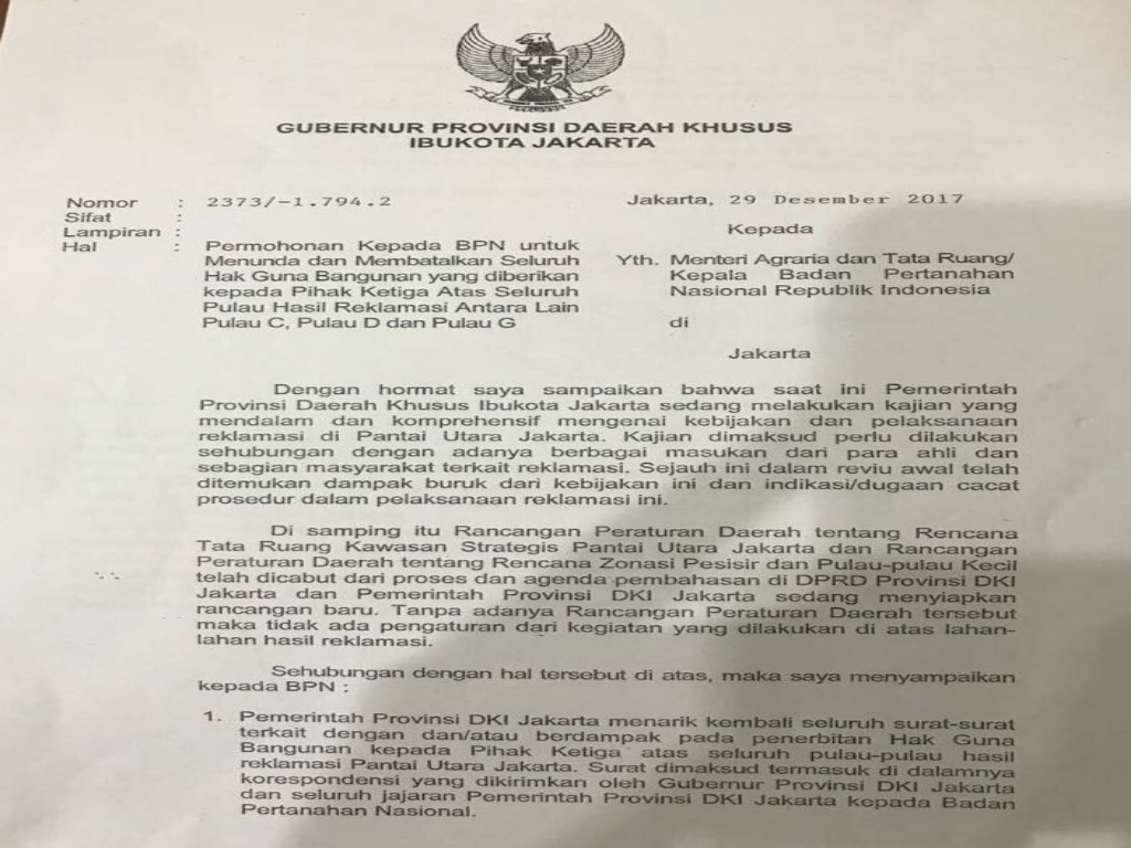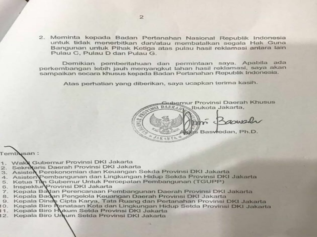 “Meminta Kepala Badan Pertanahan Republik Indonesia untuk tidak menerbitkan dan/atau membatalkan segala Hak Guna Bangunan untuk pihak ketiga atau pulau hasil reklamasi antara lain Pulau C, D, dan Pulau G,” tulis Anies dalam surat resminya.