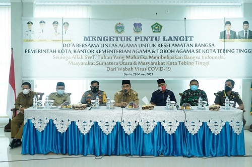 ZONASATUNEWS. COM, TEBINGTINGGI-SUMUT–Menindaklanjuti Surat Edaran Gubernur Sumatera Utara No. 450/2680,mengenai himbauan untuk melaksanakan doa bersama lintas Agama secara serentak menghadapi wabah pandemi Covid-19, Walikota Tebing Tinggi Ir. H. Umar Zunaidi Hasibuan, MM., menggelar doa bersama untuk Mengetuk Pintu Langit dengan mengusung tema “Semoga Allah SWT Tuhan Yang Maha Esa Membebaskan Bangsa Indonesia, Sumatera Utara dan Masyarakat Kota Tebing Tinggi dari Wabah Covid-19,” bertempat di Ruang Aula Lantai IV Gedung Balai Kota (29/3).