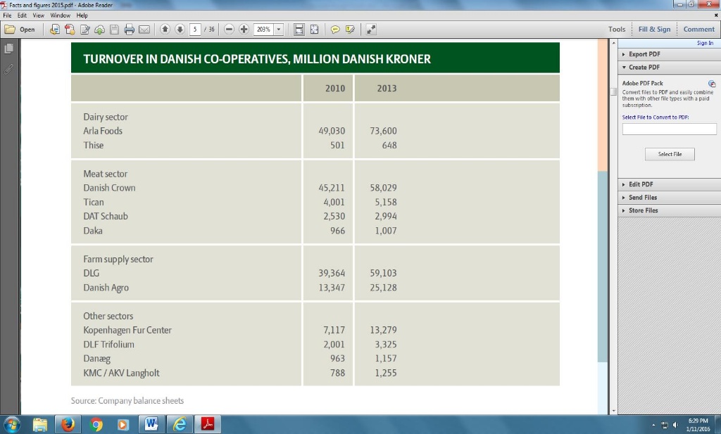 “Tabel-1. Beberapa jenis koperasi yang menguasai produk susu, daging, supply pertanian dan yang berhubungan dengan pertanian (Sumber: Danish Agriculture & Food Council, 2014)”]