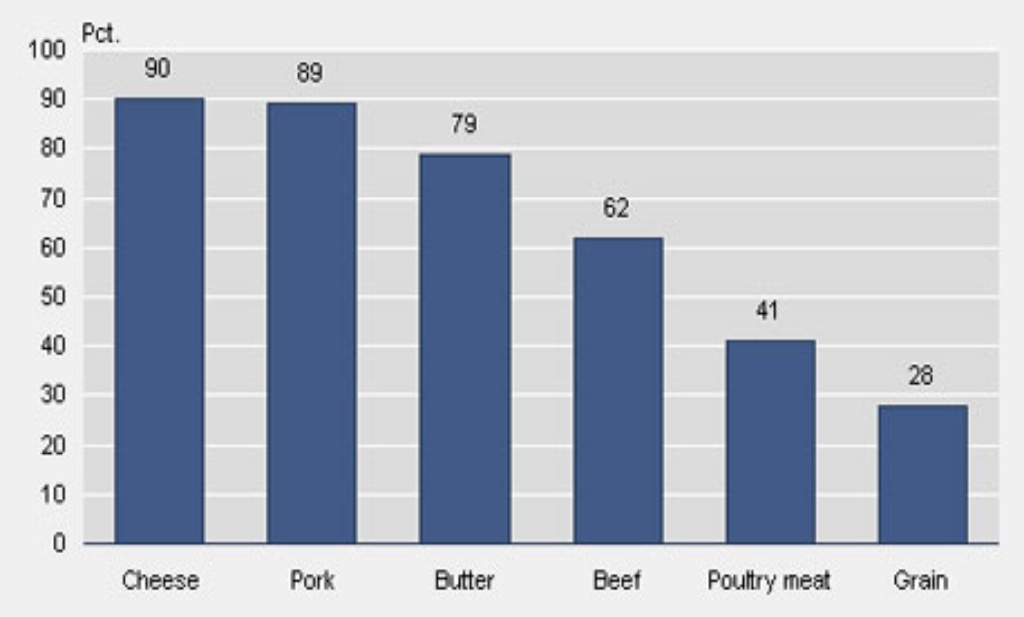 Artinya produksi pangan Denmark melimpah ruah. 30% untuk konsumsi sendiri, sisanya (70%) diekspor ke 100 negara di berbagai penjuru dunia. Ada juga disumbangkan sebagai bantuan luar negeri Denmark (DANIDA) ke negara negara Afrika atau negara yang kekurangan pangan.