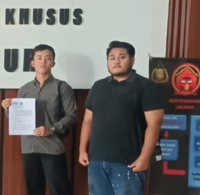 Aktivis anti korupsi Persaudaraan Milenial Indonesia Anti Korupsi (PMI – AK) Ahmad Fahmi Ardiansyah M dan Raflianzilal Nabil sedang lapaoran ke Polda Jatim, Rabu (27/9/2023)