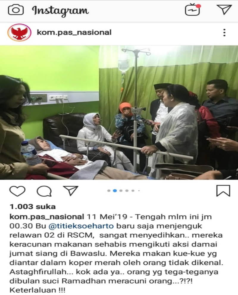 Hal tersebut diungkapkan Waketum Dua Bidang Intelijen, Keamanan dan Organisasi Gerakan Nasional Cinta Prabowo (GNCP), Muhammad Saleh yang mengatakan sebanyak 12 orang massa aksi damai di depan Bawaslu RI tadi sore mengalami keracunan usai memakan takjil yang diberi seseorang yang tak dikenal.