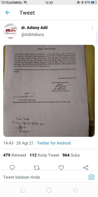 Dalam surat pernyataan tersebut dr. Adiany Adil dikatakan sebagai salah satu pihak yang berwenang dan berkompeten membuat pernyataan akan Covid-19.