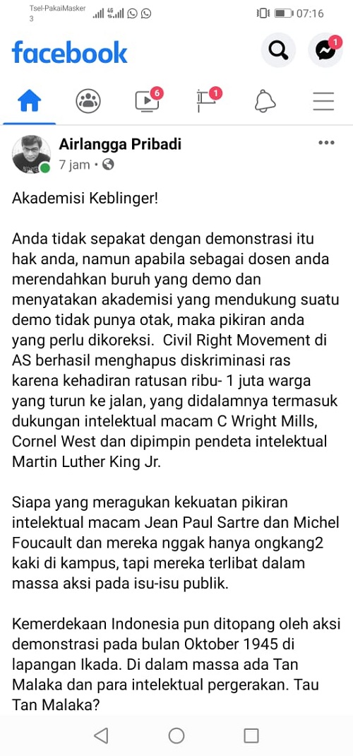 “Akademisi Keblinger! Anda tidak sepakat dengan demonstrasi itu hak anda, namun apabila sebagai dosen anda merendahkan buruh yang demo dan menyatakan akademisi yang mendukung suatu demo tidak punya otak, maka pikiran anda yang perlu dikoreksi. Civil Right Movement di AS berhasil menghapus diskriminasi ras karena kehadiran ratusan ribu- 1 juta warga yang turun ke jalan, yang didalamnya termasuk dukungan intelektual macam C Wright Mills, Cornel West dan dipimpin pendeta intelektual Martin Luther King Jr,” kata Angga.