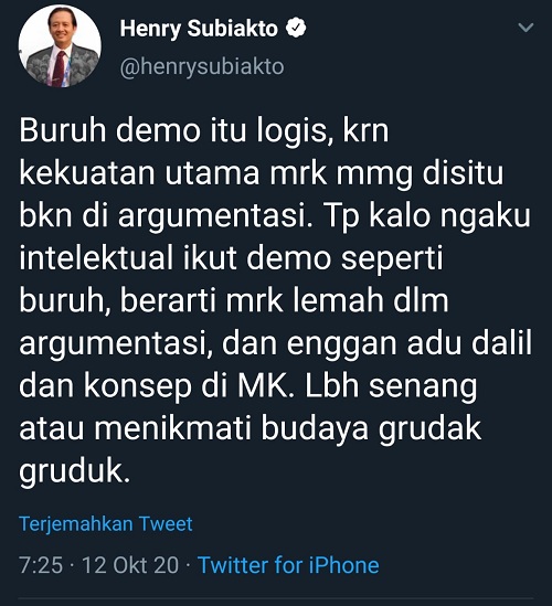 “Buruh demo itu logis, krn kekuatan utama mrk disitu, bukan di argumentasi. Tp kalau ngaku intelektual ikut demo seperti buruh, berarti lemah dalam argumentasi, dan enggan adu dalil dan konsep di MK. Lbh senang atau menikmati budaya grudak gruduk”, kata Henry Subiakto yang juga Guru Besar Unair itu.