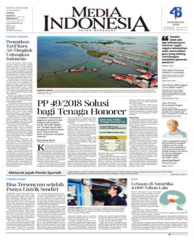 Halaman muka Harian Media Indonesia milik Ketua Umum Partai Nasdem Surya Paloh juga bersih dari foto dan berita Reuni 212. Mereka memilih berita utama dengan judul “ PP 49/2018 Solusi bagi Tenaga Honorer.”
