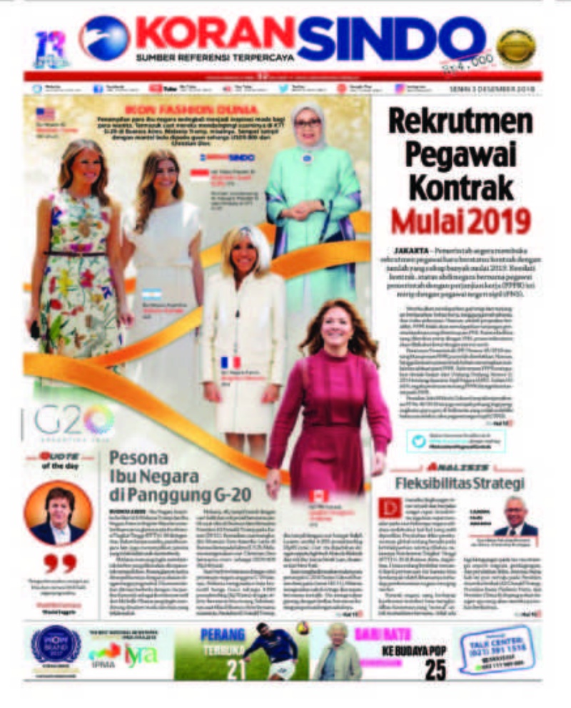 Harian Sindo Milik Ketua Umum Partai Perindo Hary Tanoe memilih berita utamanya “ Pesona Ibu Negara di Panggung G-30” dengan foto-foto mereka dalam ukuran besar. Koran Tempo memilih berita utama “Menuju Ekosistem Digital” yang ditampilkan dalam seluruh halamannya.