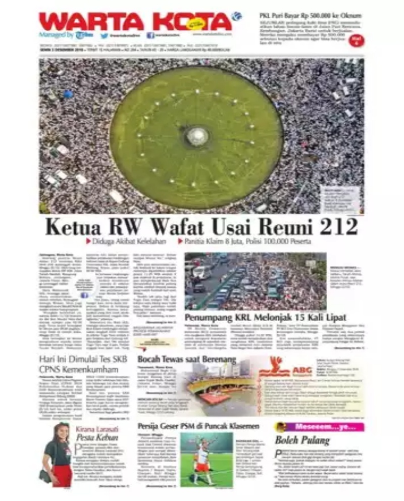 Hanya Koran Rakyat Merdeka, Republika yang memuat berita dan foto peristiwa Reuni 212 di halaman muka. Rakyat Merdeka menulis Judul “212 Makin lama, Makin Besar Kenapa Ya?.” Republika menulis Judul “Reuni 212 Damai.” Sementara Harian Warta Kota memuat foto lepas, suasana di Monas dengan judul berita yang dengan berita utama yang sangat besar “Ketua RW Wafat Usai Reuni.”