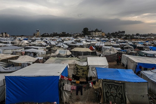 Warga Palestina yang mengungsi berjalan di kamp tenda tempat mereka berlindung, setelah hujan lebat, di Deir el-Balah. [Ramadan Abed/Reuters]